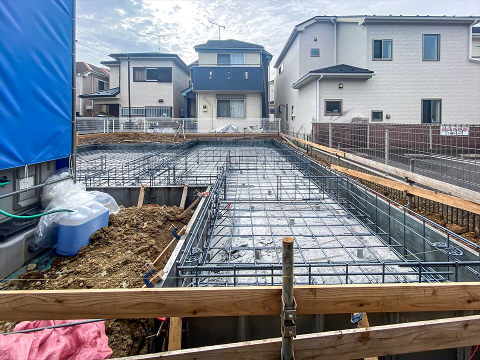 2024/10/23 自社物件 新吉田東5丁目Ⅲ 新築戸建ての基礎配筋工事。 コンクリート面から鉄筋までの距離を確保するドーナツ、ブロックのスペーサーが施工されています。これらの配筋工事は各検査機関(KBI・JIO・家も守り)の配筋検査を受けます。