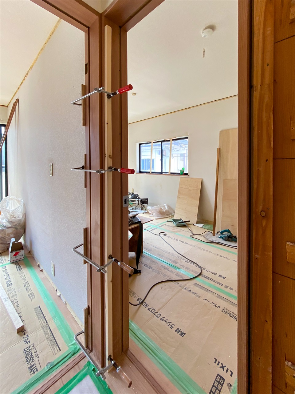 これからリビングの建具工事も始まります。和室を洋室へ変更したのでリビングと一体感が生まれました。家族構成によっては広々としたリビングとして使えると思う。