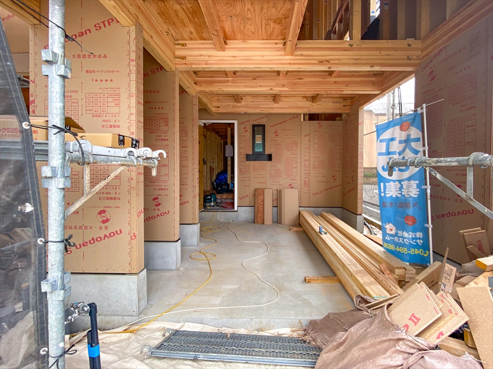 2023/04/25 新吉田東2丁目 新築分譲住宅 全2棟 A号棟サッシ取付が始まりました。 朝一番でサッシが搬入されてから大工さんが手際良く取付けております。 中間検査はB号棟4月26日、A号棟5月1日の予定です。■A号棟 サッシ取付工事