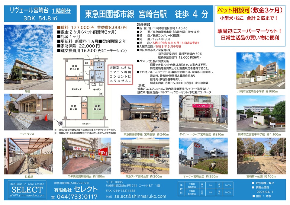 東急田園都市線 宮崎台駅 徒歩4分 リヴェール宮崎台 1階部分 3DK 54.8㎡ 12.7万円+8,000円